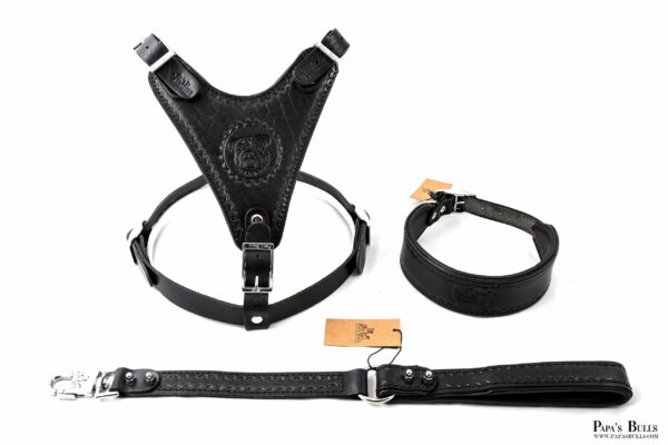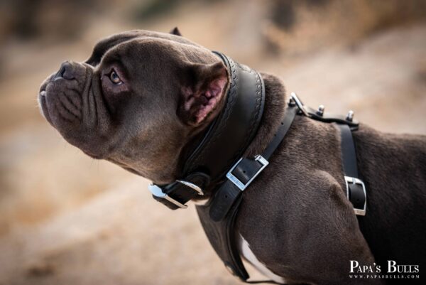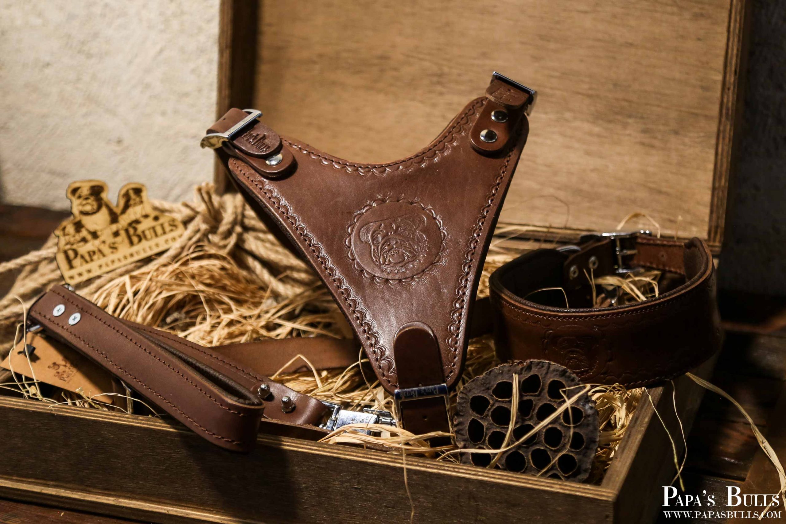 A sophisticated, strong, and stylish, our breast plated leather dog collar harness and leash set will see your pet become the talk of the park. Each is handmade to from full-grain premium leather. We have paired both the collar and harness with solid copper hardware that looks the part. In time, this collar set will become even more beautiful with wear. Scratches and oils from your hands and your dog’s coat will add further character to the leather and a patina to the brass hardware.